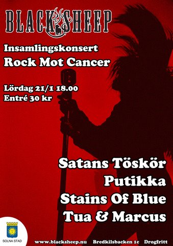 Denna konsert så kommer fyra Black Sheep band att spela och alla entré kommer att gå till insamlingen, det kommer även att säljas lotter där man kan vinna fina priser och dessa pengar kommer också att gå till insamlingen. Det kostar endast 30 kronor entré och det är drogfritt så boka in denna lördag och kom och lyssna på Satans Töskör, Putikka, Tua & Markus och Stains of blue som alla är riktigt bra band.