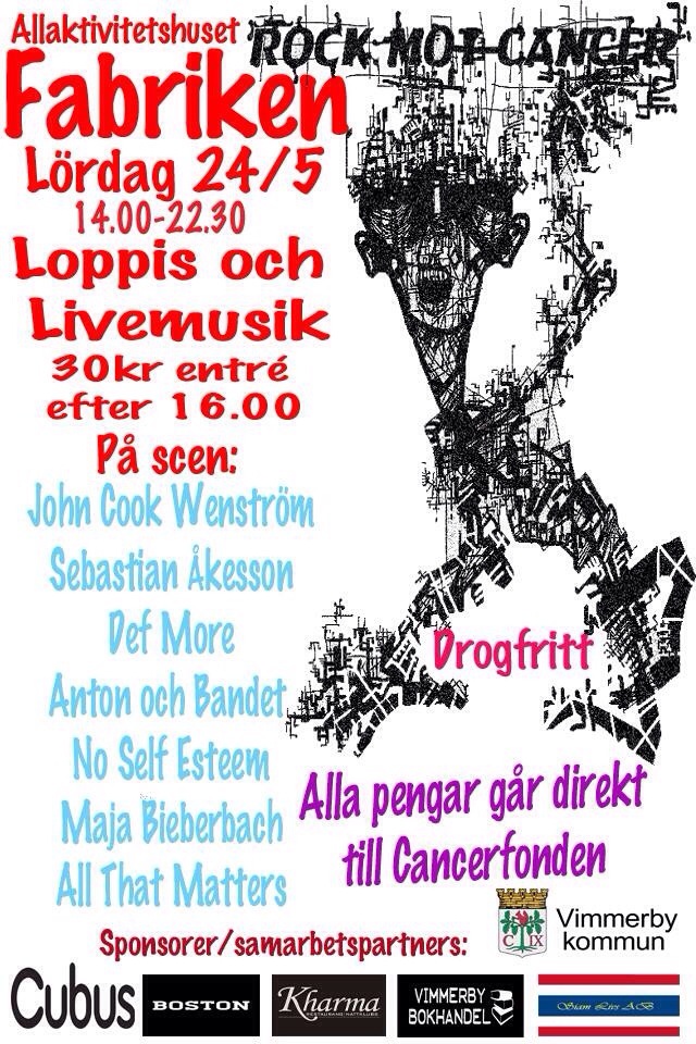 rita nått fint och väldigt långt innan jag drar iväg till Fabriken där vi idag ordnar det första Rock Mot Cancer eventet i Vimmerby. Det kommer att bjudas på loppis, lottförsäljning, zonterapi, fika, DJ kurs och självklart en massa bra livemusik. Även här har företagen i Vimmerby ställt upp genom att donera priser till lotteriet.